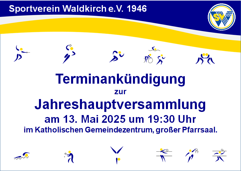 13. Mai 2025 @ 19:30 - 21:30 Jahreshauptversammlung SV Waldkirch Katholischen Gemeindezentrum Großer Pfarrsaal Kirchplatz 7, Waldkirch